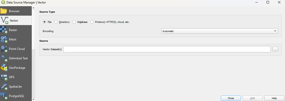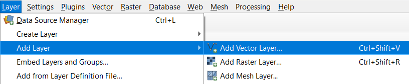 To add layers, either click the Add Vector Layer icon on the toolbar or navigate to Layer > Add Layer.