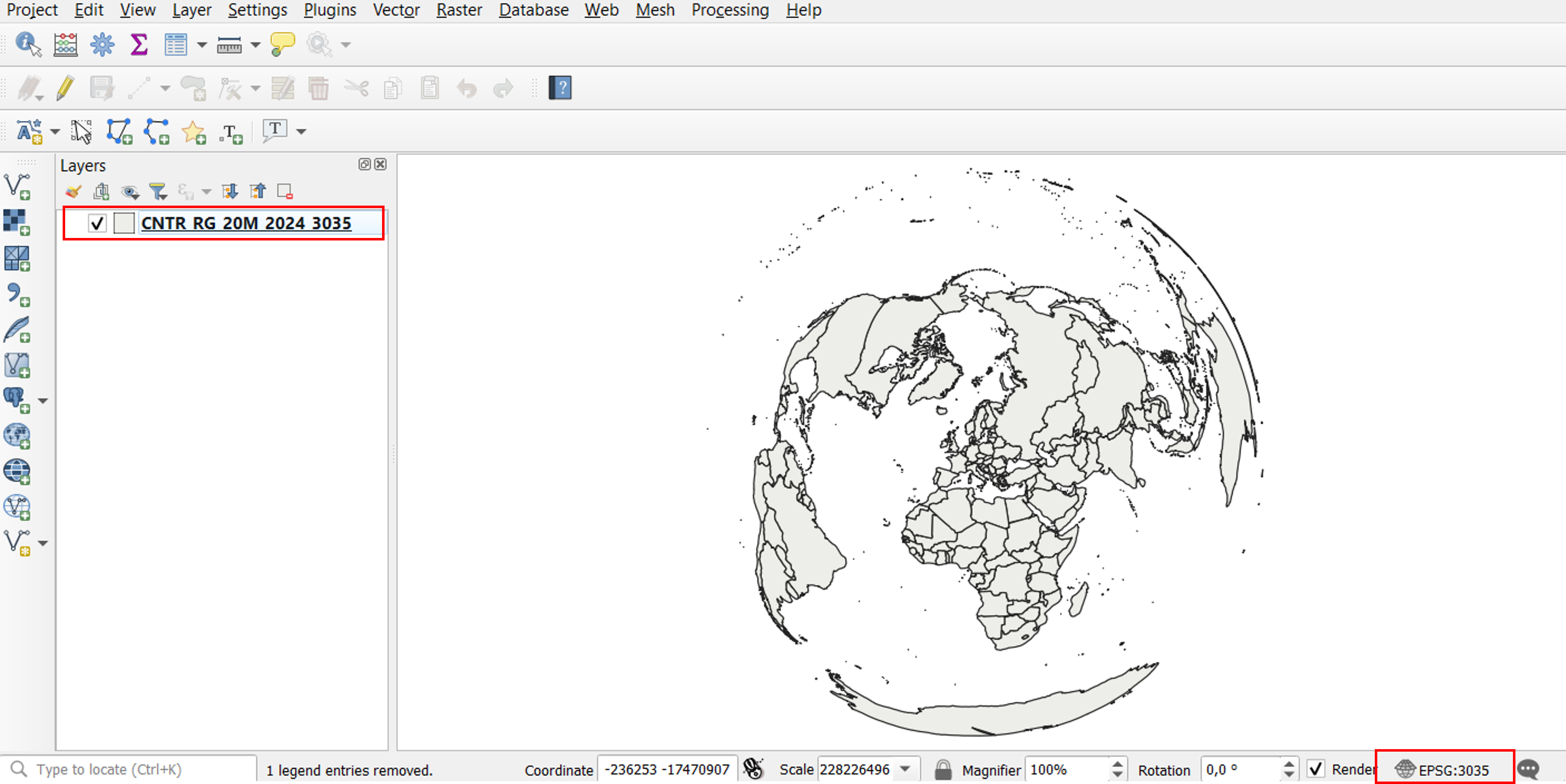 At this point, the shapefile should be visible. Verify the EPSG code to confirm that the correct coordinate reference system is in use.